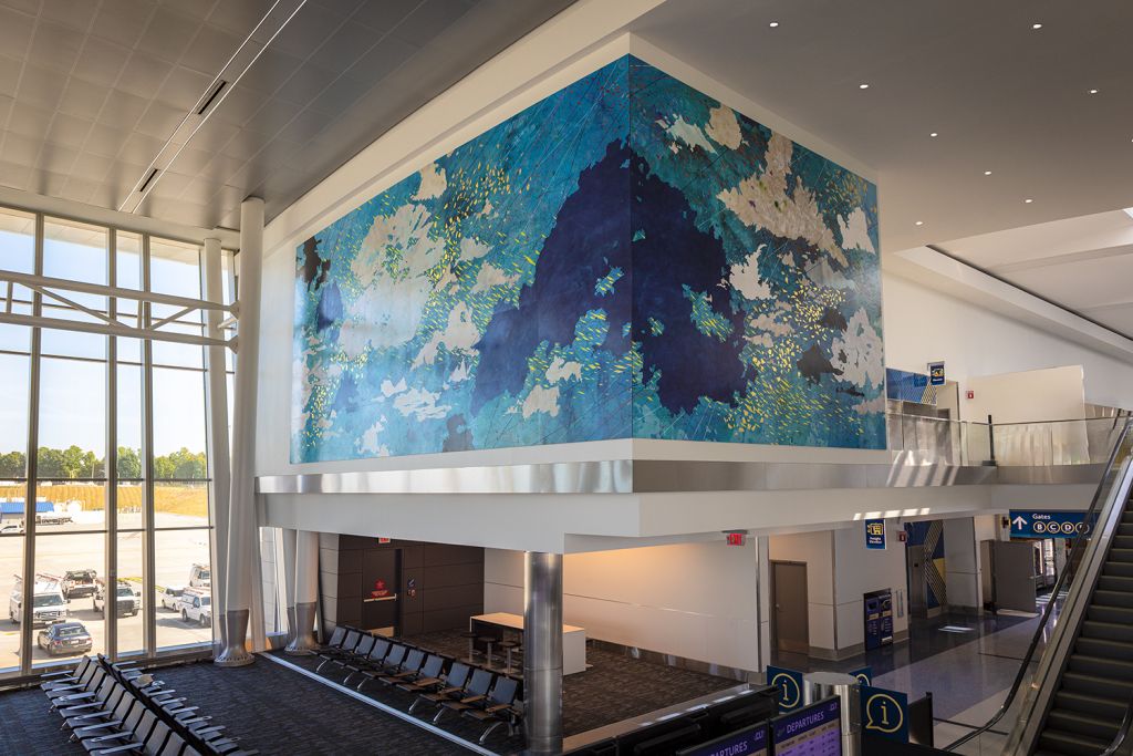 The Portland, Oregon-based artist won the commission to create an original work for Charlotte Douglas International Airport’s new Concourse A. She had a budget of $235,289 to create “Where Earth Meets Sky,” which was recently unveiled in the concourse’s west mezzanine. (ASC manages the public art programs for the city of Charlotte and Mecklenburg County.)