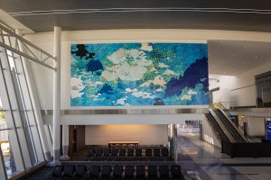 “Where Earth Meets Sky” left an outsized impression on Stewart. “We do many, many projects, and I’ve seen many different types of work,” he said. “But what Val and her fabricator accomplished is extraordinary. It really looks like a handmade collage made on a grand scale. I think anyone who comes into that concourse will be hard-pressed not to take notice.”