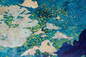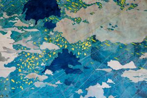 She’s not just interested in roadmaps. She incorporates data and markings from all kinds of maps in her work – including goldmining maps and something even less likely: wastewater sanitation maps. “They can tell you a lot about populations and what’s happening with health,” she said. She found these maps especially interesting, as she was working on this commission during a global pandemic.